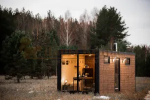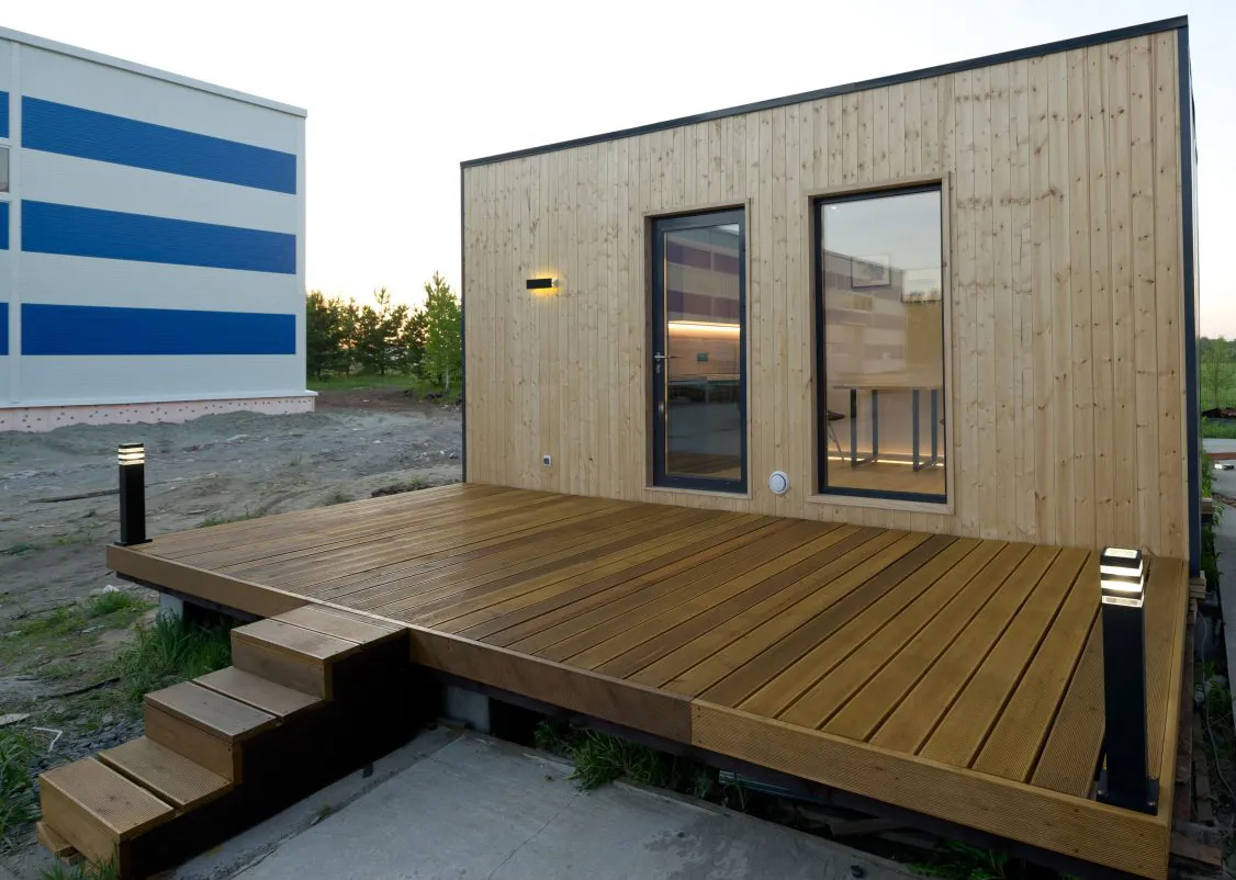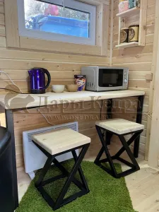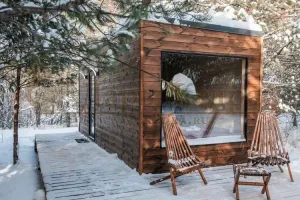 Это утепленный домик прямоугольной формы с панорамным окном и двумя помещениями: жилой комнатой и санузлом с душевой зоной. Может быть изготовлен по готовым стандартам или вашим индивидуальным размерам. Современные материалы, используемые при проектировании, отличаются экологичностью и прочностью.